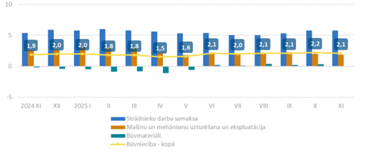2025. gada novembrī, salīdzinot ar oktobri, būvniecības izmaksu līmenis palielinājās par 0,1%. Strādnieku darba samaksa, kā arī mašīnu un mehānismu uzturēšanas un ekspluatācijas izmaksas palielinājās par 0,3%, savukārt būvmateriālu cenas samazinājās par 0,2%.