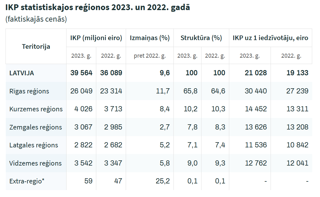 Latvijas iekšzemes kopprodukts (IKP) faktiskajās cenās 2023. gadā bija 39,6 miljardi eiro. 65,8 % (26 miljardi eiro) no Latvijas IKP attiecināmi uz Rīgas reģionu un galvaspilsētu. Salīdzinājumam gadu iepriekš Rīgas reģiona devums Latvijas IKP bija 64,6 %, liecina Centrālās statistikas pārvaldes (CSP) apkopotie dati.