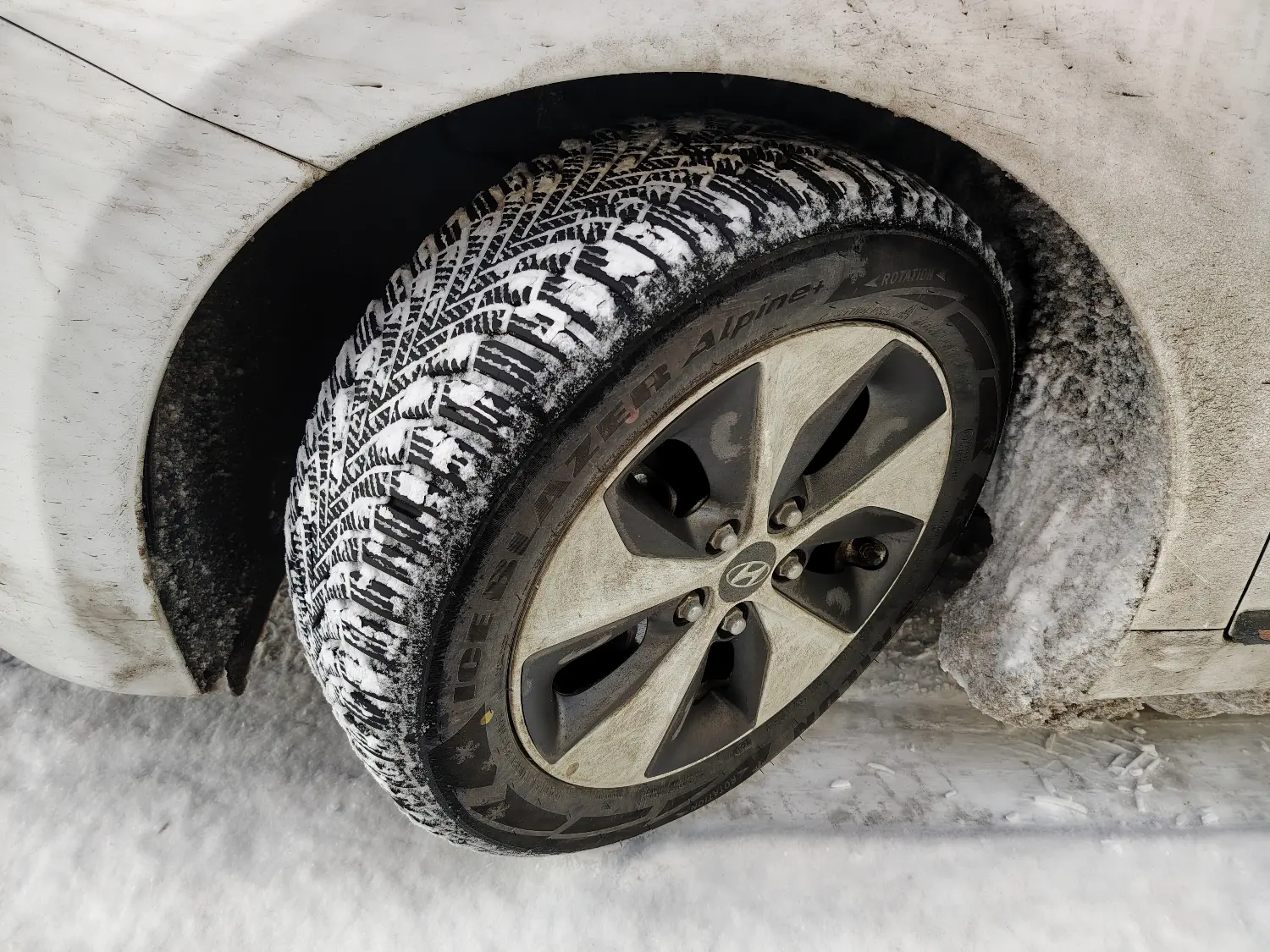 Un tad ap gadu miju beidzot uzsniga sniegs un kļuva ļoti skaidrs, ka esmu diezgan ieberzies ar šo pirkumu. Kamēr riepai ir asfalta segums aiz kā aizķerties, tā darbojas pieņemami. Auto gan stūrējas, gan bremzējas. Piemēram, attēlā zemāk redzamie apstākļi ir pieņemami. Jā, ir mazliet kaut kāds apledojums, bet braukt var.