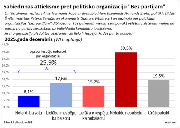 SKDS veiktā aptauja decembrī liecina, ka par kustību “Bez partijām” (tagad “Mēs mainām noteikumus”) Saeimas vēlēšanās balsotu 25,9% aptaujāto.