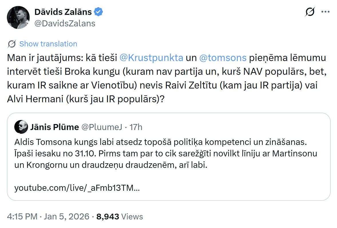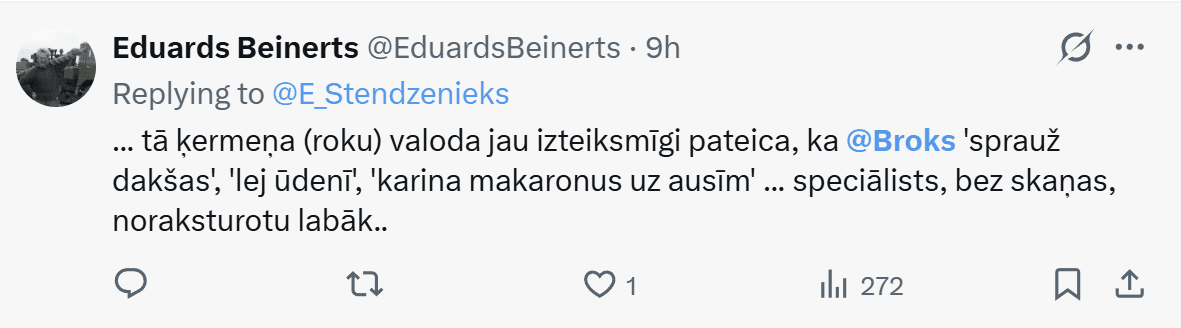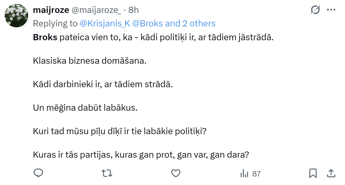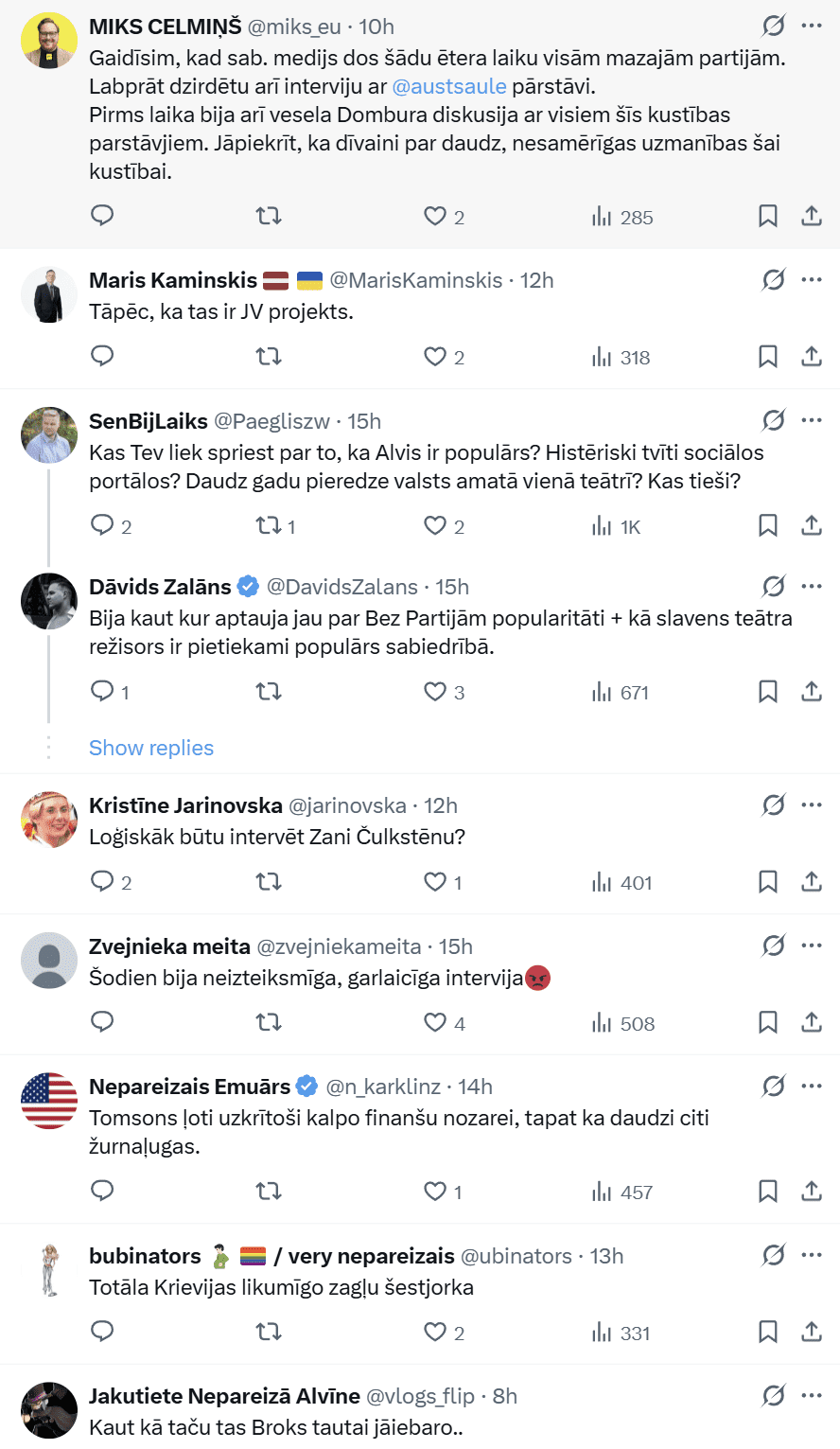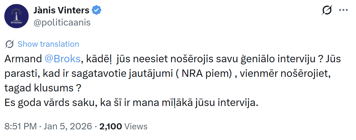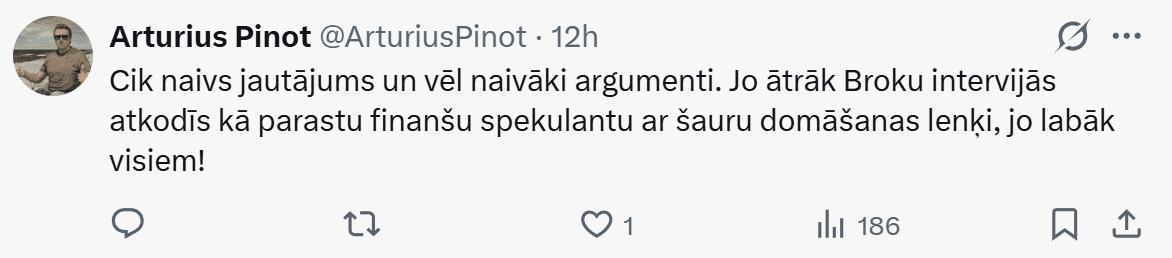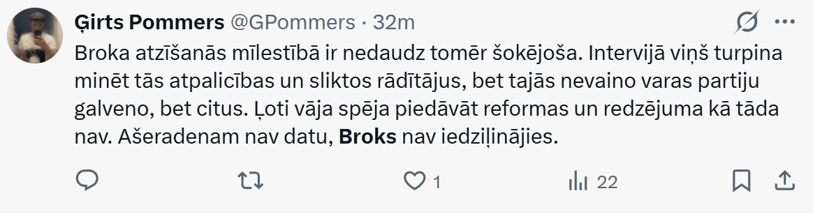 Sociālajā mediju platformā “X” cilvēki aktīvi diskutē un apmainās ar viedokļiem par Armanda Broka sniegto interviju raidījumam “Krustpunktā”.