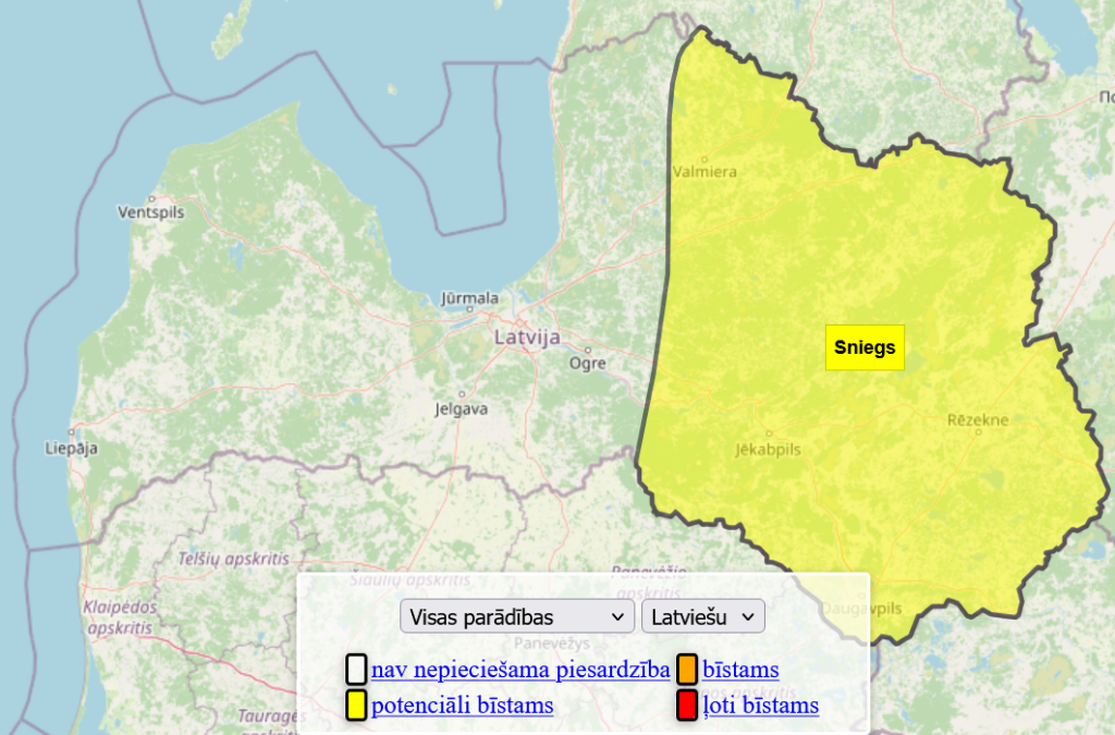 Saistībā ar snigšanu centrs izsludinājis dzelteno brīdinājumu, kas būs spēkā līdz plkst. 3.