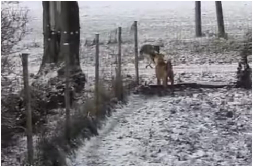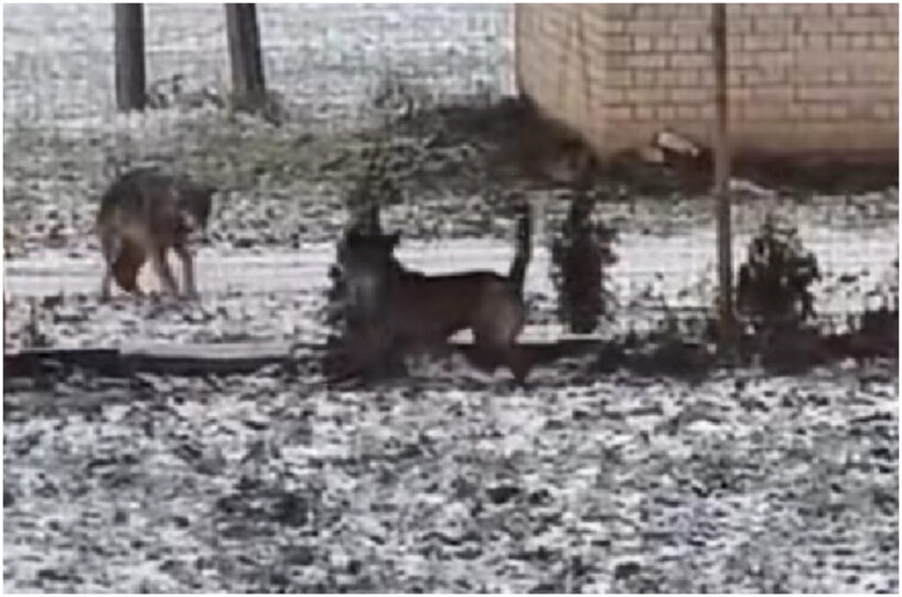 Video kadros redzams, kā savas mājas sētā rej divi branga izmēra suņi, bet aiz žoga bezbailīgi staigā garām vilks. Tālāk novērošanas kamerās redzams, ka turpat, pāri pretī, uz lauka, atrodas vēl vilki, kas stāv un visu notiekošo vēro. Video publicēts vietnē “TikTok”, kur komentāros cilvēki neslēpj arī savu satraukumu.