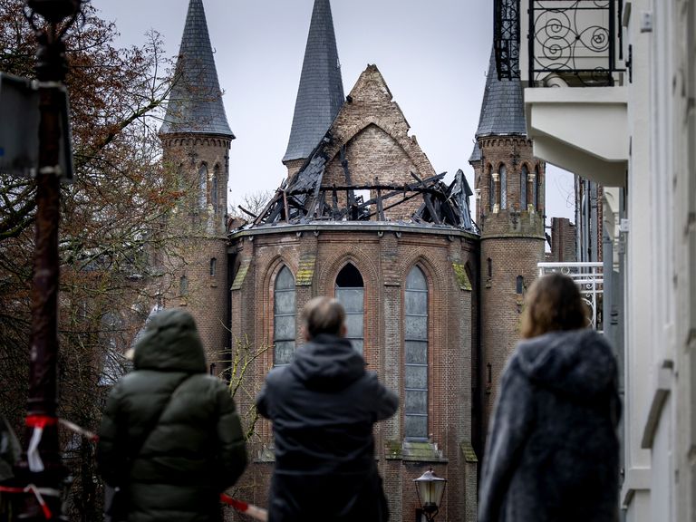 ANPDe toren is ingestort, maar de buitenmuren van de Vondelkerk staan nog overeind na de nachtelijke brand