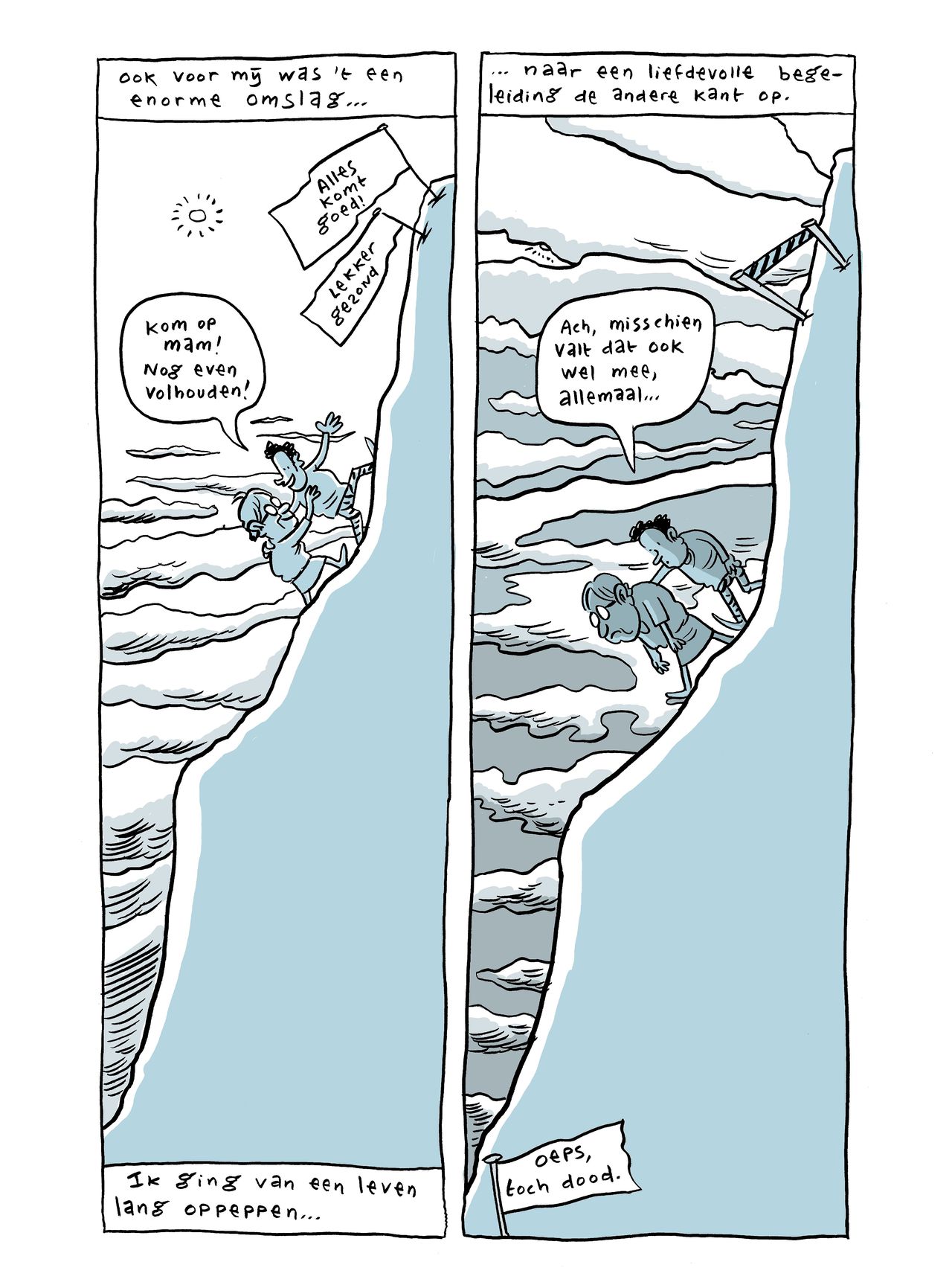 Mantel der liefde is een hoogtepunt in het oeuvre van Van de Pol, die dit jaar de Stripschapprijs ontving. Het is persoonlijk, even grappig als gevoelig en de dialogen en gedachten zijn levensecht. Van de Pol is een rasverteller die eerlijk is en dat speels en trefzeker uitbeeldt. Niets is toevallig of zomaar. Ergens halverwege leest Michiel zijn moeder de les, als hij haar weer eens lastigvalt met zijn kunstzinnige uitspattingen: „Je snapt ’t niet omdat je ’t proces niet kent.” Dat vat het hele boek samen. Met en na het overlijden van zijn moeder heeft Van de Pol veel meer geleerd over het leven dan hij voor mogelijk had gehouden. Louterend, en wij waren erbij.