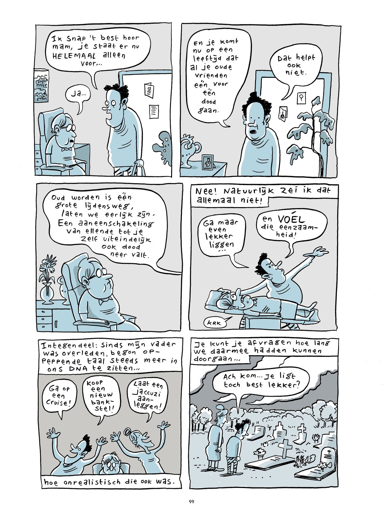 Van de Pol heeft zijn moeder neergezet als een vrolijk portret, een dame op leeftijd die zich gaandeweg steeds onaangepaster en humeuriger gedraagt. Haar dagen worden eentoniger, de bezoekjes van haar zoon zijn lichtpuntjes. Op die momenten verandert ze in een opgewekte bejaarde die meteen naar de keuken stiefelt om voor haar bezoek te zorgen. Dat Michiel zelf ook een leven, een gezin, werk en deadlines heeft, ach, koffie drinken met je moedertje is toch altijd gezellig? Nou dan!