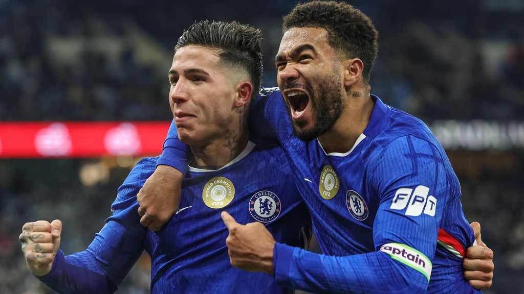 NL BeeldEnzo Fernandez (links) viert met Reece James de 1-1 tegen Manchester City
