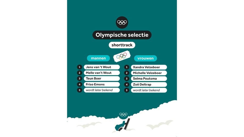 Bij de mannen liggen vier van de vijf namen al vast. Jens van ’t Wout, Melle van ’t Wout, Teun Boer en Friso Emons kunnen hun koffers vast gaan pakken. De vijfde plek is in principe voor Daan Kos, maar hij kampt met een blessure, waardoor ook Itzhak de Laat nog hoop mag houden.