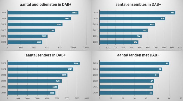In 60 landen, waarvan 35 in Europa (37 als je Turkije en Azerbeidzjan meerekent tot het Europese continent), waren op het einde van 2025 samen 942 DAB+-ensembles in de ether. Dat zijn 126 ensembles en zes landen meer dan op het einde van 2024. Het aantal radioproducten in de digitale ether (DAB en DAB+) steeg van 9.664 naar 10.820 (+1.156). Dat is iets minder dan de 1.286 audiodiensten die er in het recordjaar 2024 bijkwamen. Vooral in de eerste helft van 2025 leek de groei te vertragen tegenover de vorige jaren, maar in de tweede helft was er nog een forse inhaalbeweging (ruim 800 nieuwe stations in de laatste zes maanden). In zendtoestellen uitgedrukt zijn er vandaag 7.288 digitale zenders in band III, 640 meer dan een jaar geleden. Dat komt neer op een dagelijkse activering van 1,75 zenders en dat is wél opnieuw een record. Tot slot steeg het aantal actieve datadiensten (EPG/SPI, TPEG) van 306 naar 326. Nog een leuk weetje om mee uit te pakken op uw komende nieuwjaarsrecepties: op precies vijf jaar tijd verdubbelde het aantal radiostations op DAB+ van 5.300 (eind 2020) naar 10.820. Alle cijfers zijn afkomstig van de openbare teller van dablist.org (onderdeel van fmlist.org) die bestaat sinds 2020.