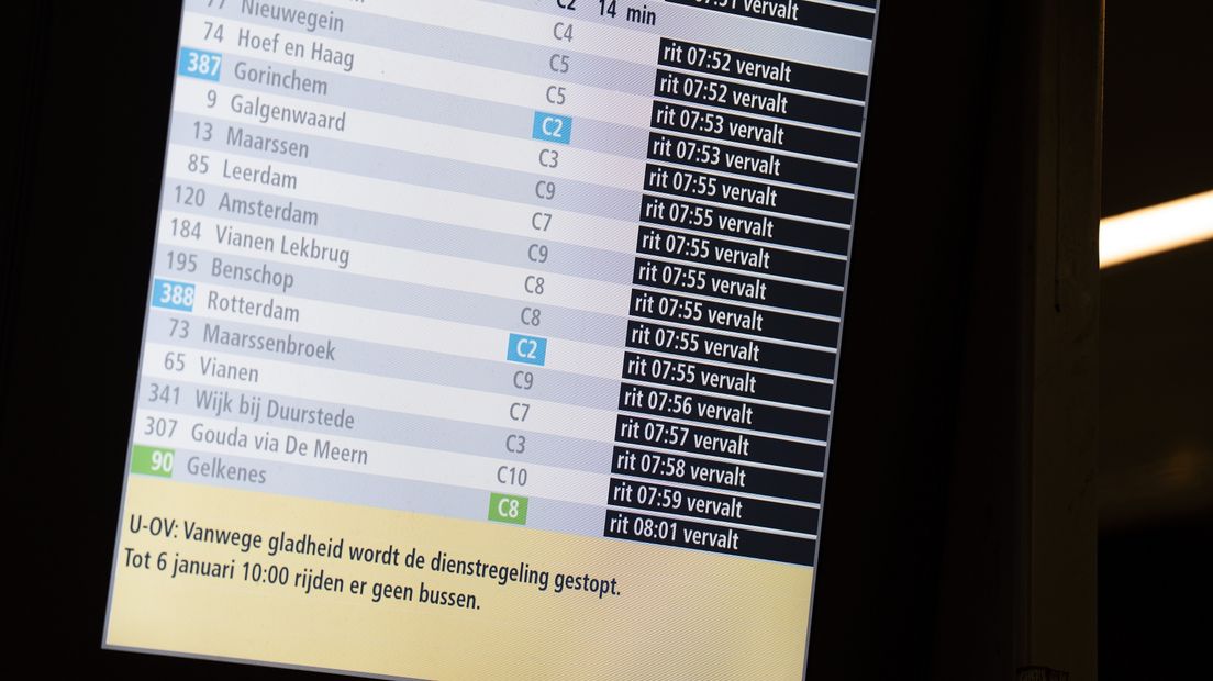 De bussen van Transdev en Keolis rijden tot in ieder geval 10.00 uur niet vanwege het winterse weer. Transdev, dat onder de naam U-OV in de regio Utrecht rijdt, gaat vanochtend bekijken of het busverkeer daarna weer kan worden opgestart. “Dat is afhankelijk van de actuele weersomstandigheden.” De vervoerder maakt daar na 08.00 uur meer informatie over bekend.