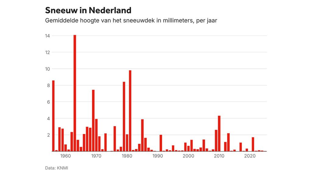 “Sneeuw is sowieso iets wat niet elke winter voorkomt, ook vroeger niet”, vertelt klimaatexpert Peter Siegmund van het KNMI. “Maar het komt deze eeuw gewoon nog minder vaak voor. Ik heb grafiekjes vanaf de jaren 50 en daarop zie je gewoon: vroeger waren er beduidend meer piekjes met sneeuw dan in deze eeuw. Dat hebben we gewoon gemeten.”