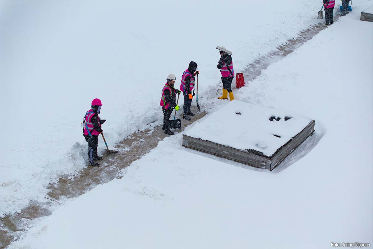 Op het dak zijn ongeveer tien mannen bezig met sneeuwschuivers om het dak te ontlasten. De sneeuw wordt in grote containers geschept, waarna deze met behulp van de hijskranen van het dak worden getild en geleegd.