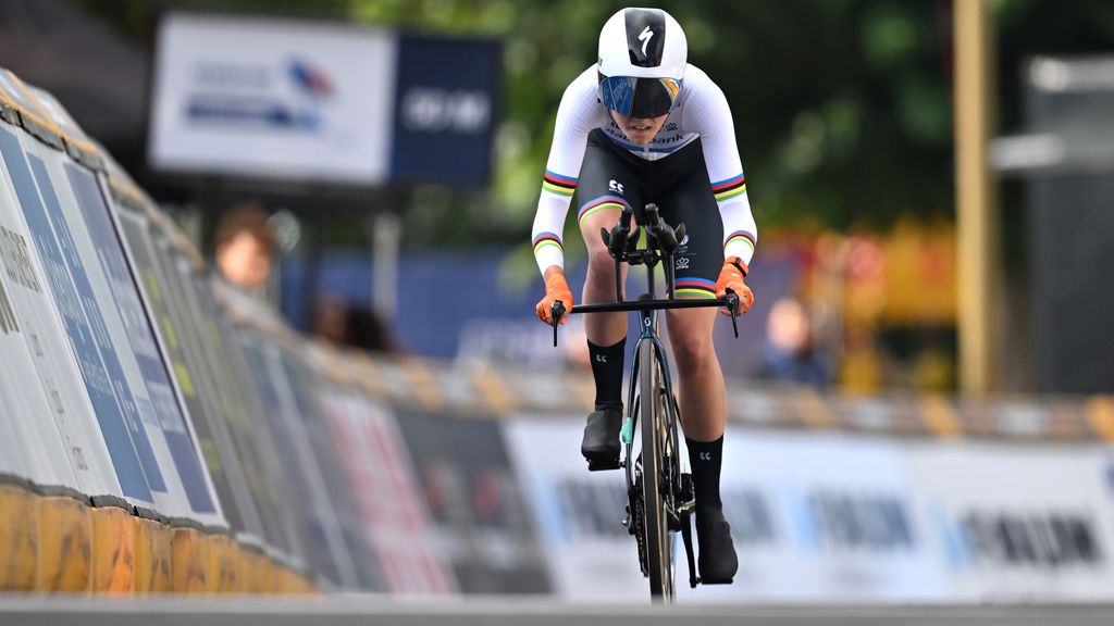 GettyMegan Arens in haar regenboogtrui op weg naar de vierde plaats bij het EK tijdrijden voor junioren.
