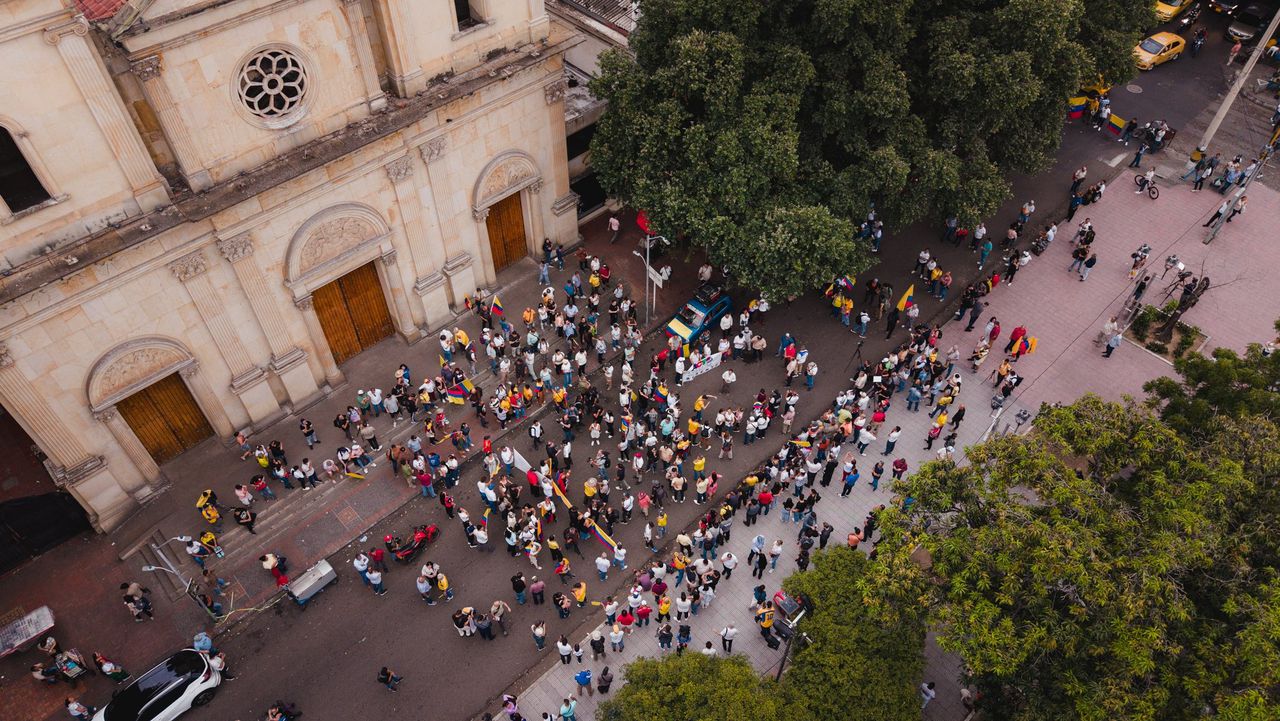 Duiven vliegen over een plein in het Santander-park waar verderop een paar honderd mensen voor een 18de-eeuwse kathedraal met Colombiaanse vlaggen zwaaien. Beta Villanueva (64) draagt een T-shirt met daarop een levensgrote foto van de Colombiaanse president Gustavo Petro en houdt haar hand op de borst terwijl ze met haar ogen dicht het volkslied meezingt. „We staan hier voor onze vrijheid”, zegt ze vol emotie. „Onze voorouders hebben hun levens opgeofferd voor de strijd tegen de Spanjaarden. Dankzij hen leven wij in vrijheid en zijn we onafhankelijk, maar dat wordt nu bedreigd door Trump, die denkt dat hij God is, alles kan bepalen en zomaar landen in onze regio kan binnenvallen.”