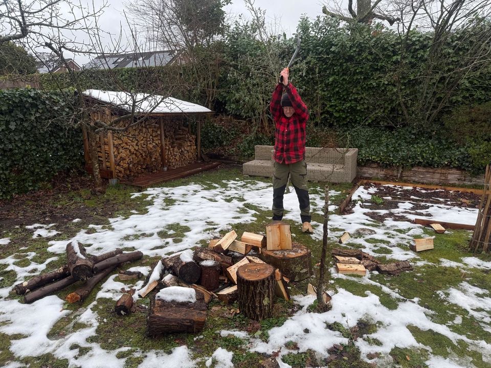 NOSJeroen Kuhlmann hakt hout in zijn tuin