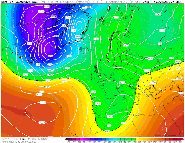 Het gemiddelde van de 500 hPa geopotentiaal (gpdm), temperatuur (C) en bodemdruk (hPa). Verwachting van dinsdag 13 januari 2026, 06Z, voor donderdag 22 januari 2026, 06Z. Met de oostelijke stroming keert de continentale kou terug naar het westen.