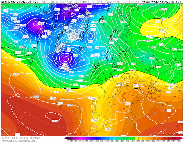 500 hPa geopotentiaal (gpdm), temperatuur (C) en bodemdruk (hPa). De verwachting van maandag 12 januari 2026, 12Z voor woensdag 14 januari 2026, 12Z. Westcirculatie verdrijft de winterkou naar Rusland.
