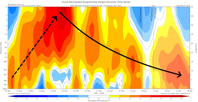 Eind december bereikte de hogedruk opnieuw de onderste kilometers van de troposfeer. Die bracht de Atlantische blokkade, met koud winterweer bij ons. Later in januari lijkt hetzelfde te gaan gebeuren, nu versterkt door de secondaire opwarming.