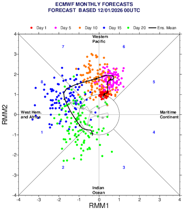 Het verloop van de Madden-Julian Oscillation (MJO) index. Verwachting van 12 januari 2026: rood is dag 1, roze dag 5, oranje dag 10, blauw dag 15 en groen dag 20. Binnen de cirkel (de afgelopen tijd) is het signaal te zwak voor significante uitwerking. Zwarte lijn: de gemiddelde prognose.