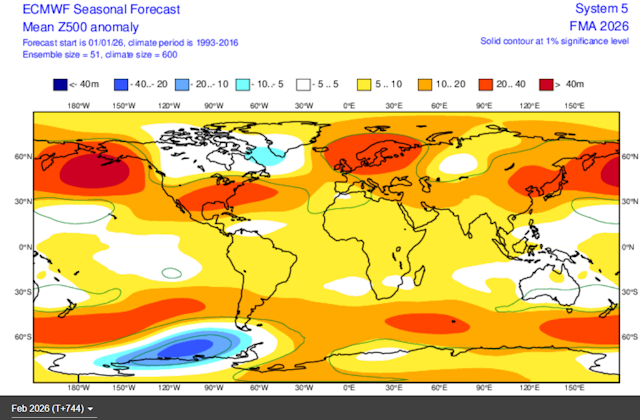 De ECMWF seizoensverwachting, de anomalie van de 500 hPa geopotentiaal. Getoond wordt de gecombineerde verwachting voor februari, maart en april. Het vervolg voor de meteorologische lente wijkt weinig hiervan af.