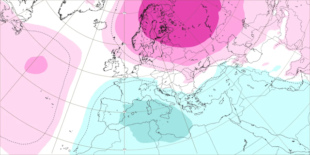 De afwijking van de geopotentiaal op 500 hPa voor de periode van 26 januari tot 2 feburari 2026. Een sterk signaal voor hogdruk boven Oost-Scandinavië. Lagedruk boven de Middellandse Zee.