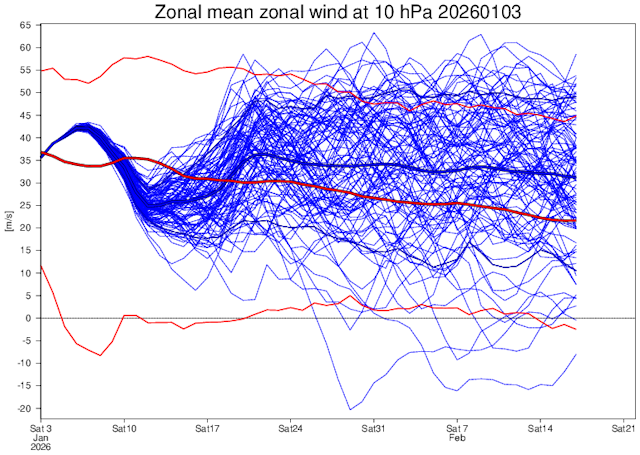 Zonale wind op 10 hPa, 60 graden noorderbreedte. Berekening van 3 januari 2026 (ECMWF). Begin januari wordt de zonale wind kort weer boven normaal, vanaf de tweede week van januari komt hij onder normaal. Eind januari een langduriger herstel van de stratosferische poolwervel.