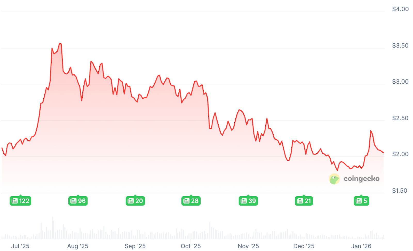 Die opwaartse beweging bleek echter van korte duur. Op het moment van schrijven staat XRP op 2,06 dollar. Daarmee is de munt er nog niet in geslaagd overtuigend te breken met de neerwaartse trend die sinds de zomer is ingezet.