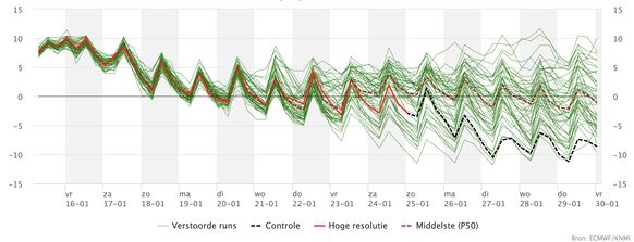 Hiermee vormt zondag het omslagpunt naar een ander weerbeeld, omdat volgende week de wind overwegend uit oostelijke richting blijft waaien. Hierbij is het droog en waarschijnlijk veel ruimte voor de zon. De temperaturen dalen hierbij geleidelijk: overdag enkele graden boven nul en ’s nachts enkele graden vorst.