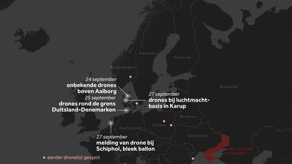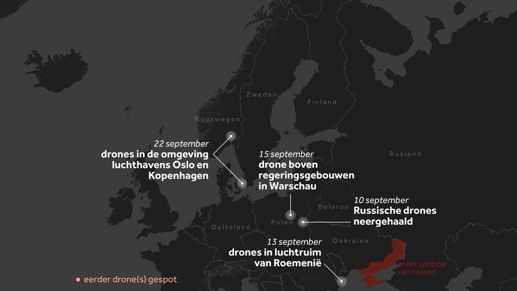 De luchthavens van Oslo en Kopenhagen gaan urenlang dicht, omdat er meerdere drones worden gezien. Het is niet duidelijk wat voor drones dit zijn en waar ze vandaan komen. De Deense premier Frederiksen beschouwt de onbekende drones als “een serieuze aanval” op de Deense infrastructuur.