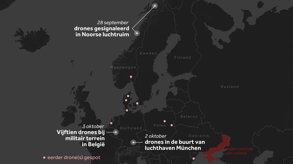 Straaljagers in actie, luchthavens urenlang dicht: op steeds meer plekken in Europa zijn deze weken incidenten met drones. Zo werden er vannacht vijftien drones gezien boven een militaire basis in België. In München lag het vliegverkeer urenlang plat na meldingen over drones.