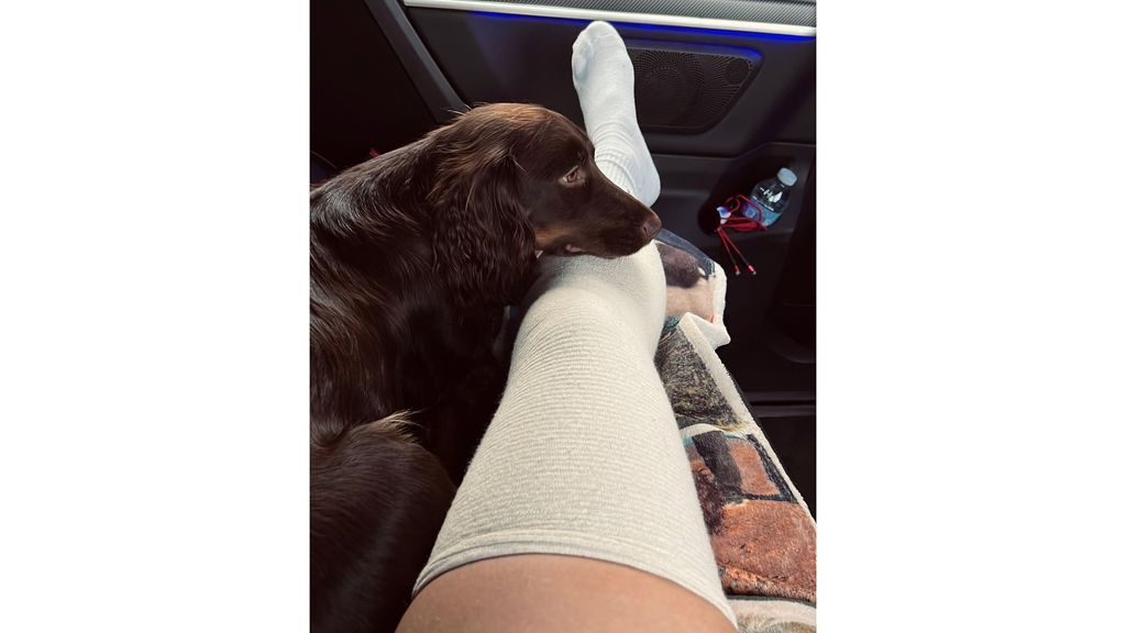 Instagram/Vivianne MiedemaVivianne Miedema met knieblessure in 2024, met hond Myle Meadema (samentrekking van haar achternaam en die van partner Beth Mead)