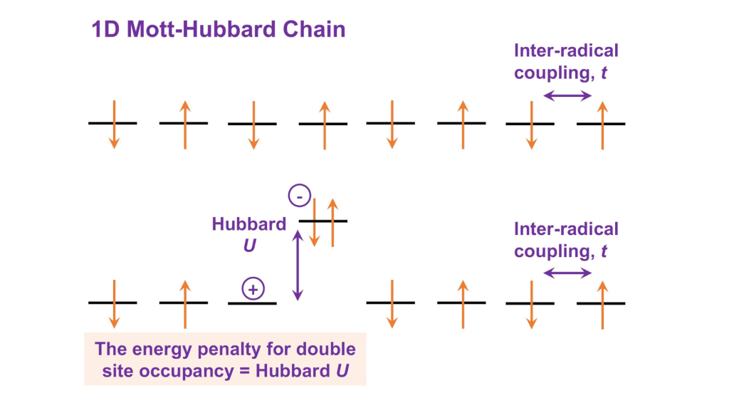 Wanneer deze moleculen dicht op elkaar worden gepakt, richten de ongepaarde elektronen van naburige moleculen zich afwisselend omhoog en omlaag. Dit gedrag is een kenmerk van de Mott-Hubbard-fysica. Een fenomeen dat tot nu toe alleen bekend was uit complexe, anorganische materialen zoals metaaloxiden.
