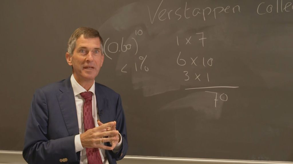 Zijn er nog meer scenario’s waarin Verstappen kampioen wordt? Ja, maar het zijn er niet veel. Voor enkele berekeningen neemt de bijzonder hoogleraar even de tijd. Een kort intermezzo aan de rekentafel en het college van Koning kan weer vervolgd worden bij het krijtbord.
