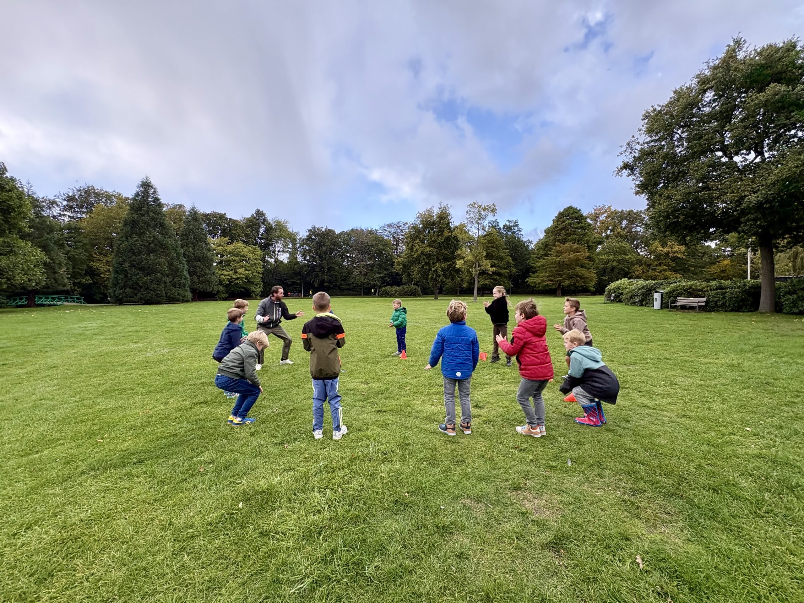 Gymmeester Daan sport met kinderen in Park Rusthoff.