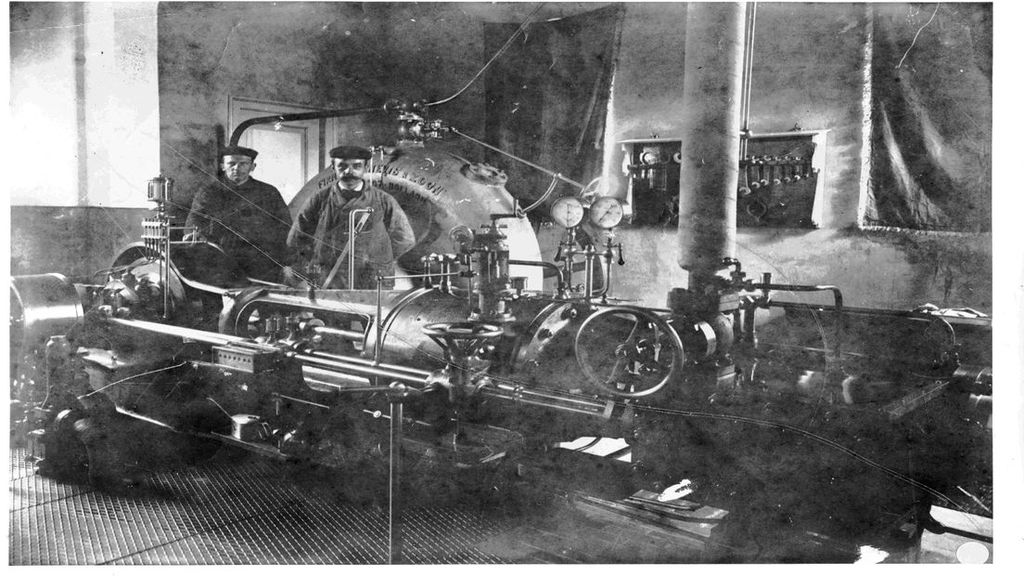 De fabrikant en machinist van het stoomgemaal op een oude foto: