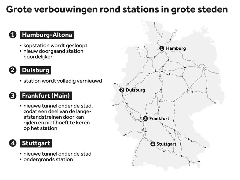Alles wordt op dit moment aangegrepen om de dienstregeling betrouwbaarder te maken. In meerdere grote steden worden kopstations, waarbij treinen moeten keren, verbouwd tot stations met doorgaande lijnen. Dat gaat gepaard met flinke kosten- en deadline-overschrijdingen. Zo had het project ‘Stuttgart21’, zoals de naam doet vermoeden, al lang af moeten zijn.