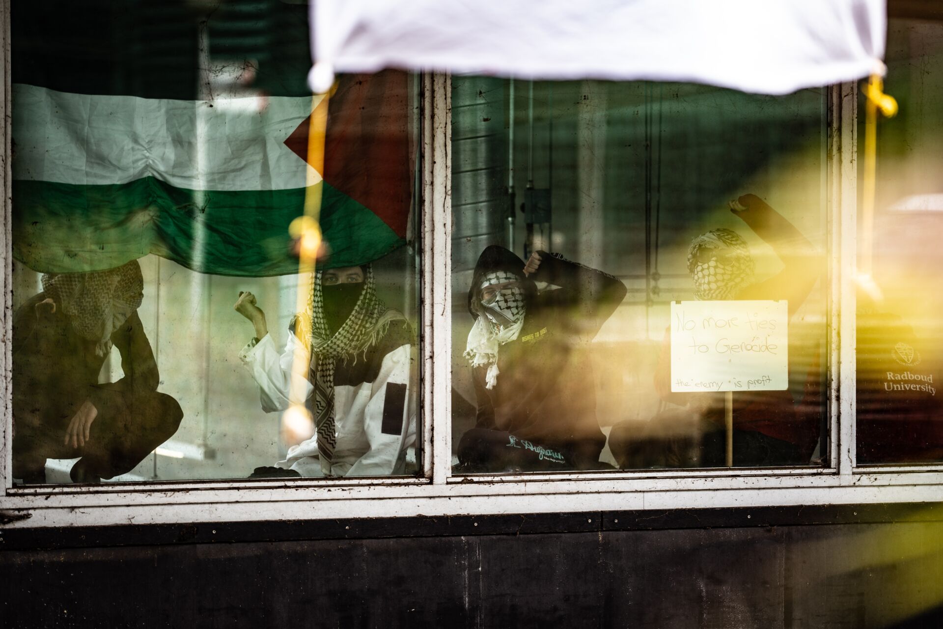 De activisten kozen voor het Goudsmitpaviljoen omdat de onderzoeker die de Horizon-subsidie ontvangt volgens hen verbonden is aan het Institute for Molecules and Materials (IMM) dat onder andere in dit gebouw huist. ‘We zitten hier net zolang totdat de banden worden verbroken’, vertelt de woordvoerder. ‘We gaan het niet toelaten dat er onderzoek wordt gedaan in dit gebouw. Terwijl dat onderzoek ervoor zorgt dat Palestijnen hun levens verliezen.’