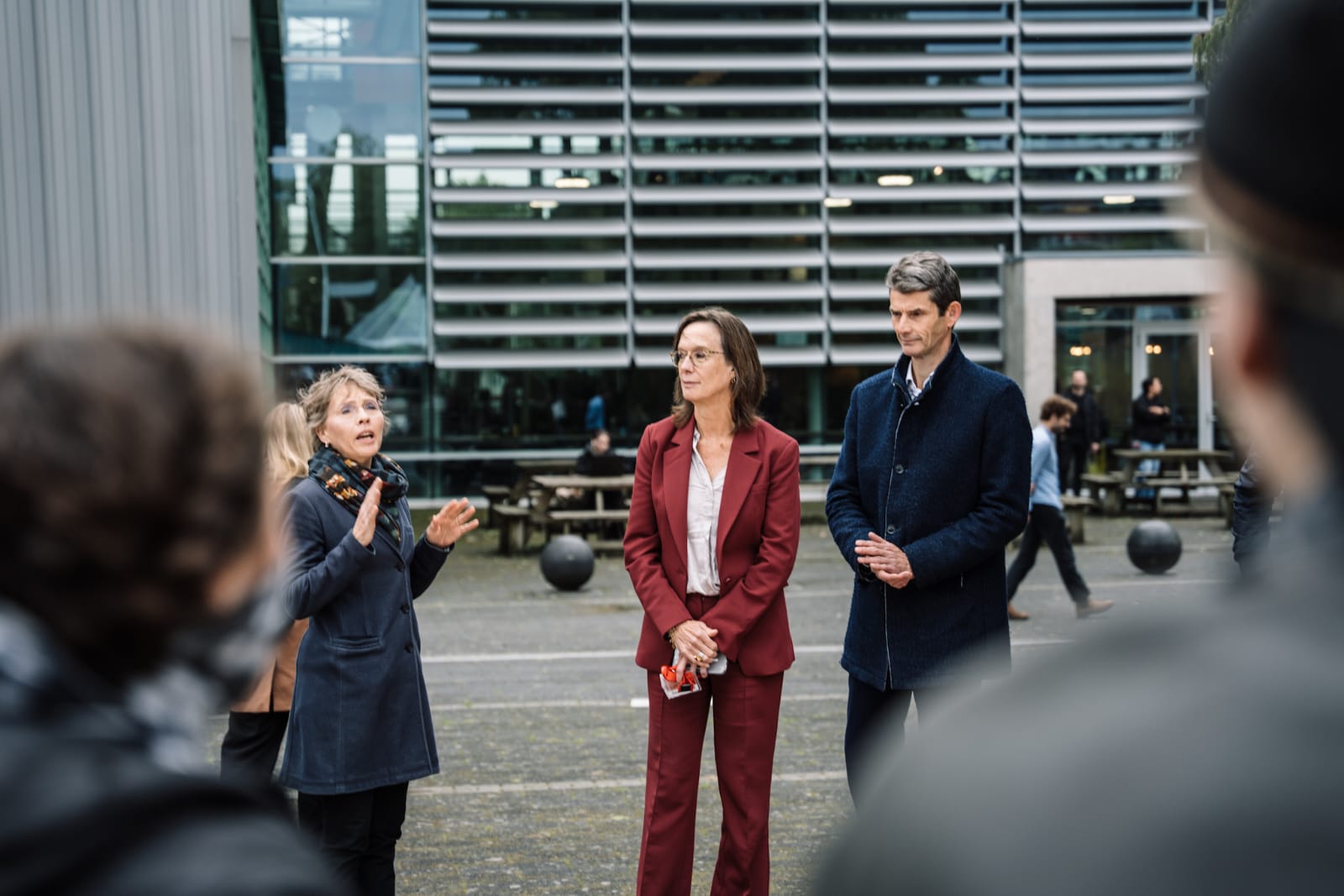 Het college van bestuur bij het bezette gebouw. Foto: Johannes Fiebig