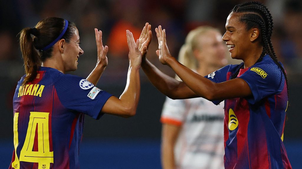 ReutersAitana Bonmati en Esmee Brugts vieren de derde treffer van FC Barcelona