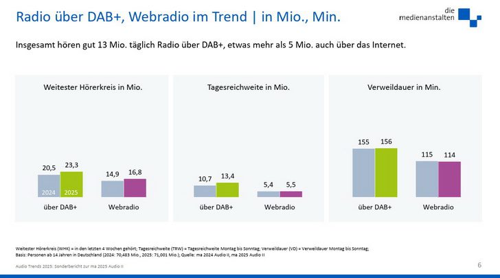 We brachten in september al een gedeeltelijke inkijk in de nieuwste Audio Trends van de Duitse mediaregulatoren. Nu is het volledige rapport verschenen. Hieruit blijkt dat inmiddels 78 procent van de Duitsers wel eens naar radio via digitale kanalen luistert. Dat komt overeen met 51 miljoen mensen, een stijging ten opzichte van de 75 procent in 2024. Meer dan een vijfde van alle radioluisteren verloopt via DAB+ en webradio. DAB+ bereikt maandelijks 23,3 miljoen luisteraars en dagelijks 13 miljoen, met een gemiddelde luistertijd van 156 minuten. Webradio telt 16,8 miljoen maandelijkse en 5,5 miljoen dagelijkse gebruikers. Ongeveer 40 procent van de huishoudens bezit een DAB+-toestel, en de helft van de bevolking heeft toegang tot een digitaal radiotoestel.
