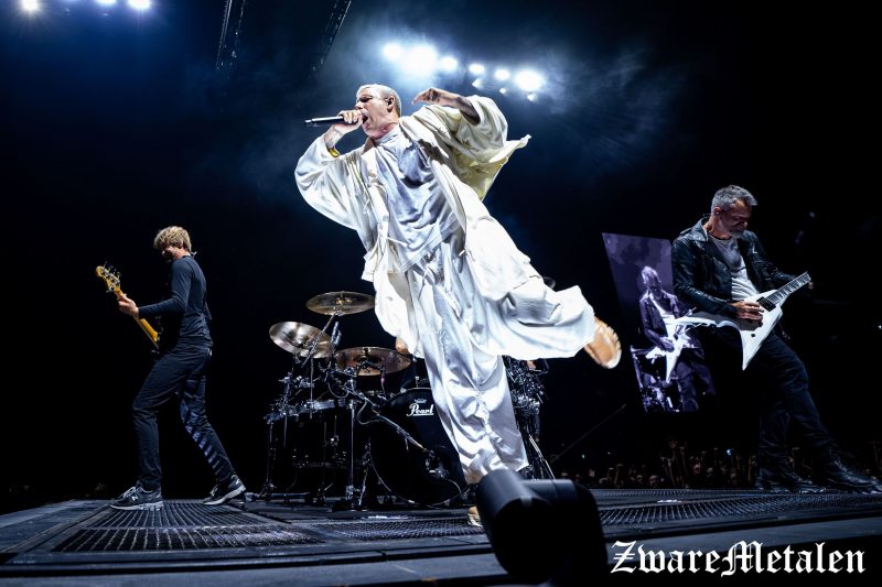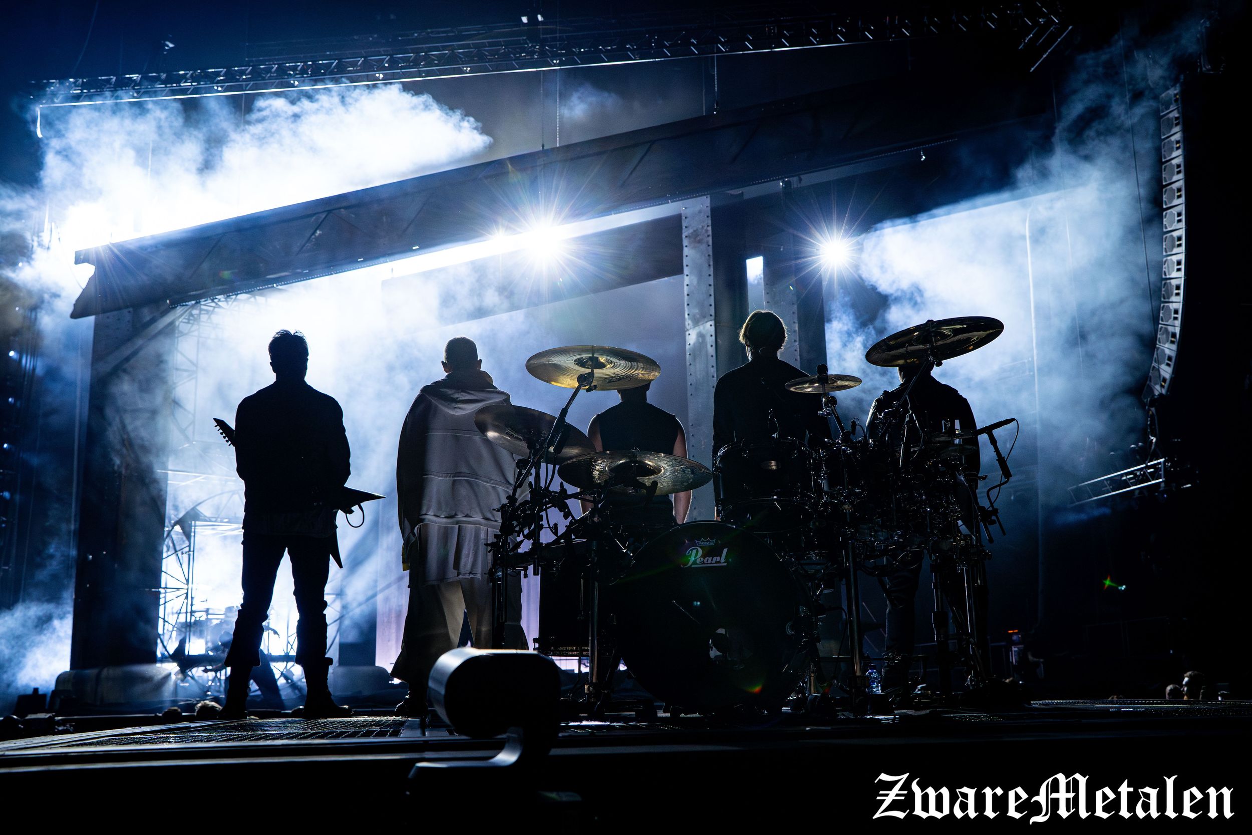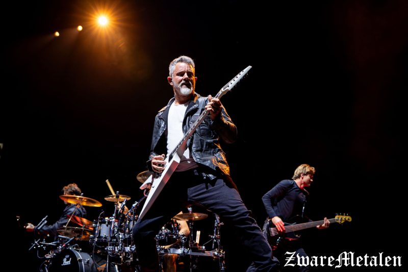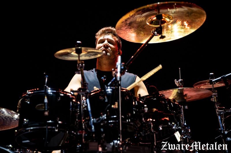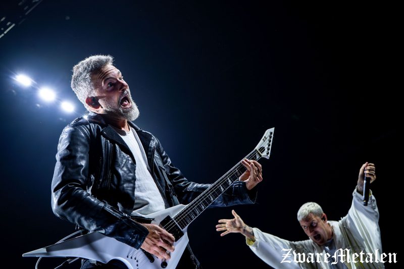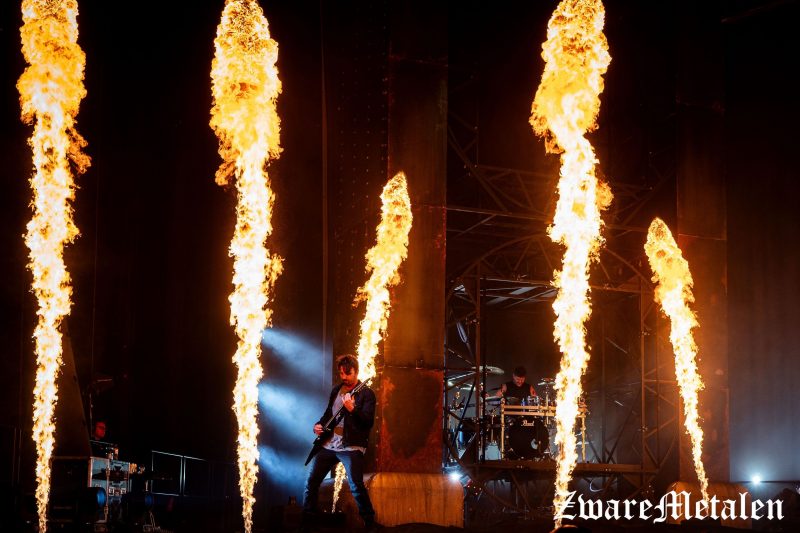 Na Dark Days en Idols and Anchors komen de drie strijkers – die we van voorgaande tours kennen – het podium op voor Chronos en Darker Still. Een bekend trucje, maar het past goed in het spektakel van deze avond. Ook zij gaan een keer met de ophaalbrug de lucht in om vanaf daar verder te spelen. Bottom Feeder is de energieke harde track waar ik op zat te wachten als afsluiter van de reguliere set. Dit harde nummer zorgt nog voor de nodige moshpits en meeschreeuwende bezoekers. Het vraagt om meer en uiteraard krijgen we dat. Want als “toegift” wordt eerst Crushed ingezet waarbij drummer Ben Gordon zijn moment kan pakken en gebruik kan maken van de stellage die ze uit de opslag mee hebben genomen. Deze interessante constructie bevat namelijk een systeem waardoor het hele drumstel op de kop draait. Maar of het nummer daardoor wordt herinnerd betwijfel ik. Tijdens dit nummer staat de pyro namelijk vol aan, ook wanneer Winston bovenin op de ophaalbrug staat spuit het vuur aan alle kanten de zaal aan. Een indrukwekkend en heet aanzicht, vet! Helaas komt de avond nu echt ten einde, maar niet voordat iedereen nog even de gitaarpartij van Wild Eyes mee heeft kunnen schreeuwen. De dankwoorden voor de bezoekers en de volledig crew zijn op zijn plaats, want zonder zo’n crew hadden ze nooit zo’n dikke show neer kunnen zetten.