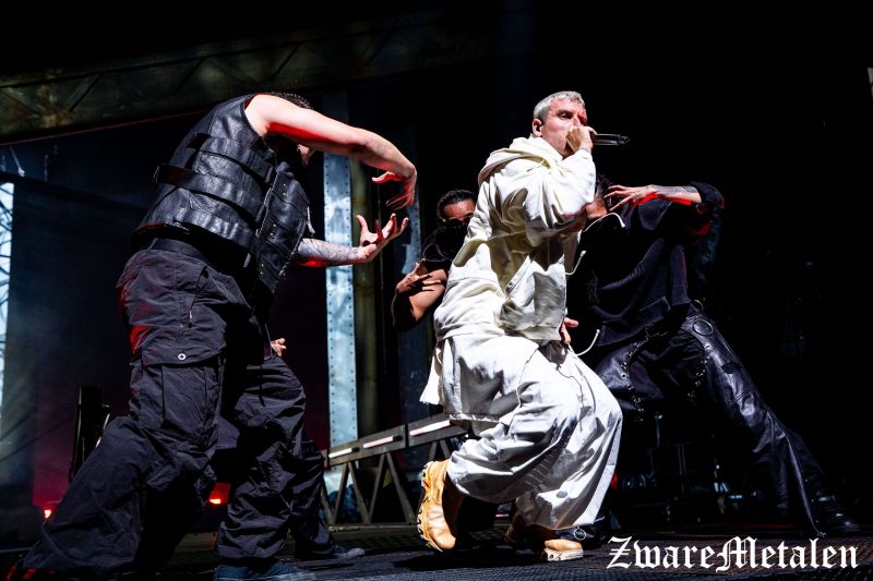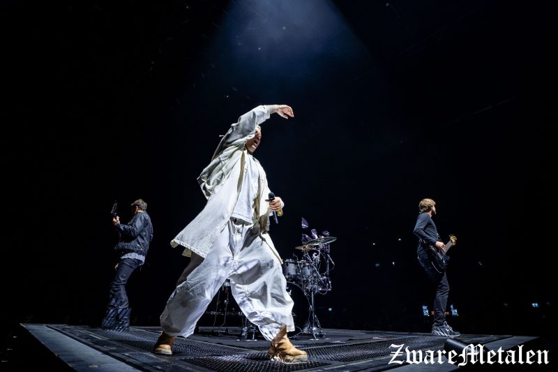 Nu iedereen matig opgewarmd is is het tijd voor het feestvarken van de avond. Parkway Drive opent de show met de hele band op een podium in het midden van de zaal. Direct worden Carrion en Prey opeenvolgend de Ziggo Dome ingepompt. Met zo’n opening weet je dat dit een hete avond gaat worden. Na deze nummers valt het doek naar beneden en wordt voor het eerst van de avond zichtbaar waarom de voorprogramma’s het met beperkte ruimte moesten doen. Er staat een grote brug op het podium. In de hoek staat het drumstel in een stellage die ook bij een eerdere tour is gebruikt. Niet heel spannend, maar ik ben blij dat het grootste gedeelte van het decor is vernieuwd ten opzichte van de laatste tours. Ondersteund door een groep dansers gaan ze vanaf het normale podium verder met twee relatief nieuwere nummers: Glitch en Sacred. De show zit strak in elkaar, misschien wel iets te strak. Vanwege de grote productie lijkt iedere positie van elk bandlid ingestudeerd te zijn. Dit valt vooral op wanneer een loopbrug vanaf het plafond van de Ziggo Dome naar beneden zakt en er een nummer gespeeld gaat worden vanaf het extra podium. Op vaste momenten lopen ze de brug op of wisselen ze van positie op het podium. Hierdoor is de spontaniteit verdwenen. Niet gek met zo’n grote productie en de vele showelementen, maar het voelt wel gek in combinatie met de muziek. Na de meezinger Vice Grip wordt Boneyards samen met Joel Birch ingezet. Winston neemt hierna een momentje om alle fans te bedanken voor de jarenlange support en geeft aan dat ze speciaal voor deze gelegenheid twee andere Australische bands in het voorprogramma mee hebben genomen. Nu is het tijd voor de volgende oude: Horizons. Twee nummers die ik al zeker tien jaar niet meer live heb gehoord en meteen ben ik mijn bovenstaande gezeur vergeten. Wat is het vet om dit weer live te horen! Bij Horizons staat gitarist Jeff Ling op de ophaalbrug en bij de solo gaat deze brug inclusief de nodige effecten te lucht in.