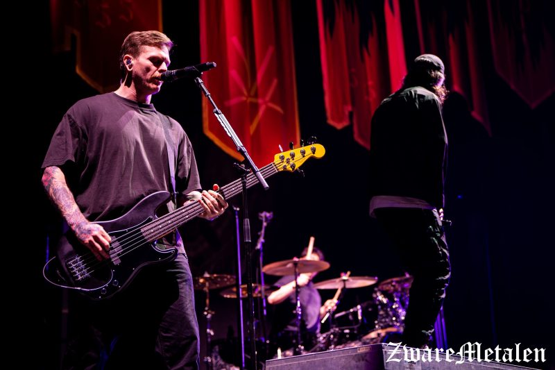 De avond wordt geopend door de post-hardcore van The Amity Affliction. Om eerlijk te zijn ken ik weinig van deze band en laat ik mij verrassen. De verrassing blijft voor mij echter uit. De muziek grijpt mij niet, de performance is ook wat tam. Of dit door de band komt of door de beperkte podiumruimte waar zij zich op moeten bewegen weet ik niet. Vanwege het decor van Parkway Drive moeten beide voorprogramma’s het namelijk doen met een klein podium. Zanger Joel Birch probeert tevergeefs het publiek enkele keren mee te krijgen. De volgende keer toch maar een kleinere en vollere zaal. Waarschijnlijk komen ze dan beter tot hun recht.