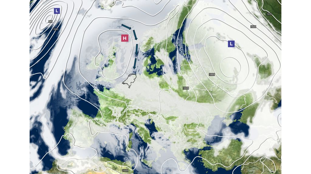 Op onderstaande foto is het hogedrukgebied ten noordwesten van Nederland te zien. Dat drukgbeied zorgt voor noordenwind (pijltjes) en veel bewolking in Nederland en onze buurlanden: