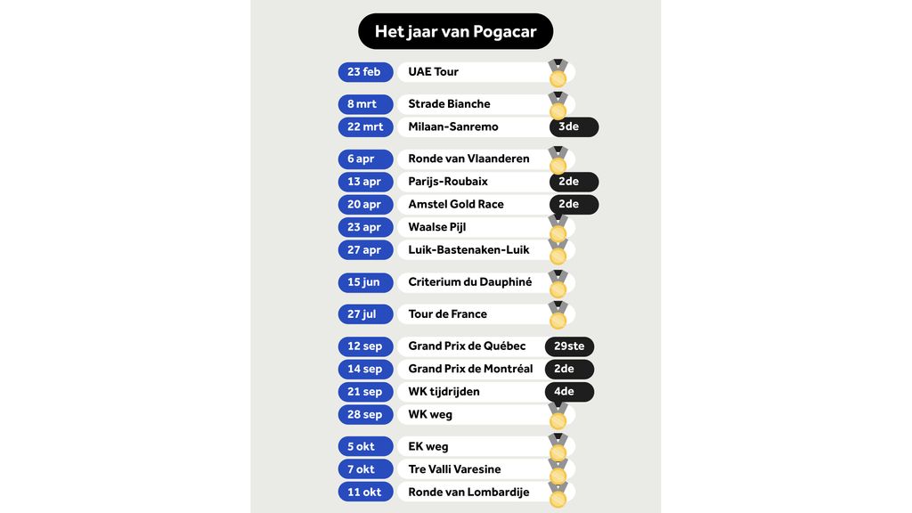 De laatste 75 kilometer reed Pogacar alleen op het glooiende parcours. De concurrentie, zelfs tijdrijder Remco Evenepoel, kwam geen steek dichterbij. Het was illustratief voor het seizoen, waarin weinig renners op dezelfde finishfoto staan als Pogacar. Of het nou in Strade Bianche, Ronde van Vlaanderen, Luik, het WK of het EK was. Overal reed hij de concurrentie op minúten.