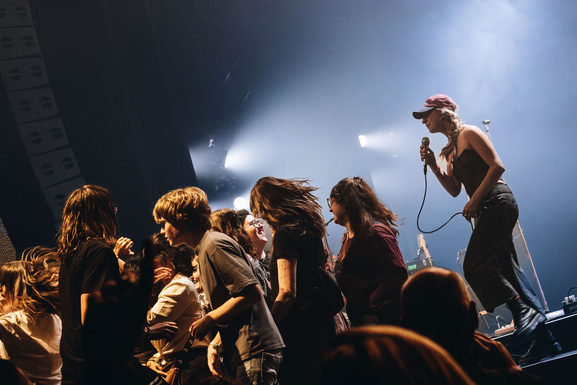 En doorrrr… Op het immense podium van Main is Coach Party afgetrapt. De vier van het eiland Wight brachten recent het poppy – en in onze optiek wat gladgestreken – album Caramel uit. De tracks zijn live een stuk gepeperder. ‘Where the fuck are my girls?’, declameert frontvrouw Jess Eastwood, waarop meteen een dozijn meiden het podium beklimt.