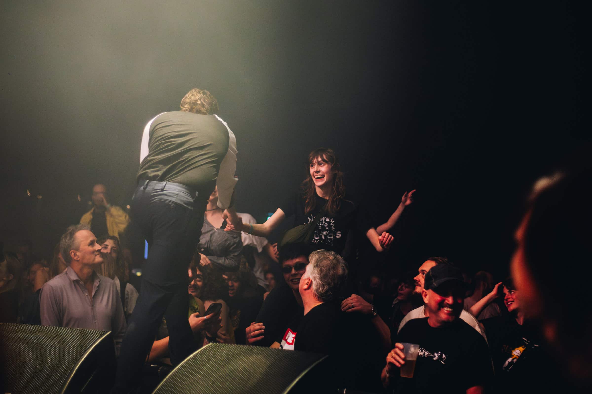 In de Basement is het meteen duidelijk: hier past niemand meer bij. Door het glas zien we Eosine, samengeperst op een klein podiumpje. Elena Lacroix heeft een stem die moeiteloos door muren snijdt. I’ve never been much of a talker, staat op haar shirt. Hoeft ook niet, als ze maar zingt. Eosine is shoegaze met Waalse melancholie en met een stem die de kelder tot kathedraal verheft. Kay Koopmans van Marathon staat er glunderend bij: ‘Op 29 december zijn ze ons voorprogramma in de Grote Zaal van Paradiso!’