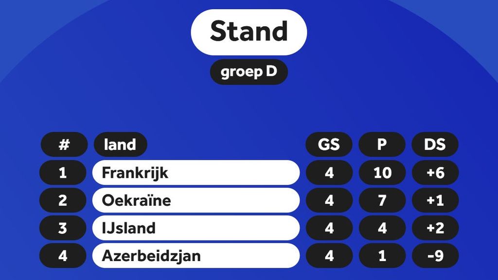 FC Twente-middenvelder Kristian Hlynsson profiteerde op snelheid van de gigantische ruimte die Frankrijk achter de defensie liet en schoot de gelijkmaker achter doelman Mike Magnan. Frankrijk gaat nog wel aan de leiding met tien punten, drie meer dan Oekraïne. IJsland heeft vier punten nog wel zicht op de play-offs.
