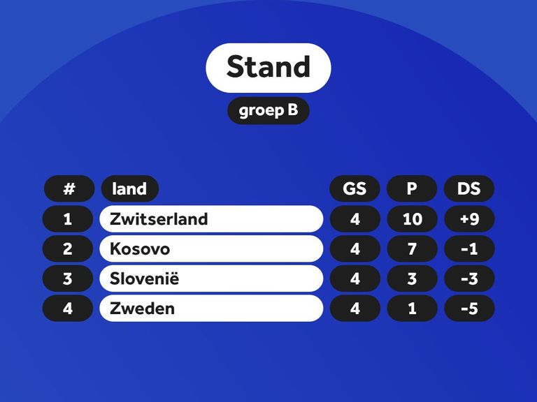 Met zeven punten staat Kosovo nu drie punten achter koploper Zwitserland, dat niet verder kwam dan 0-0 in het uitduel met Slovenië.