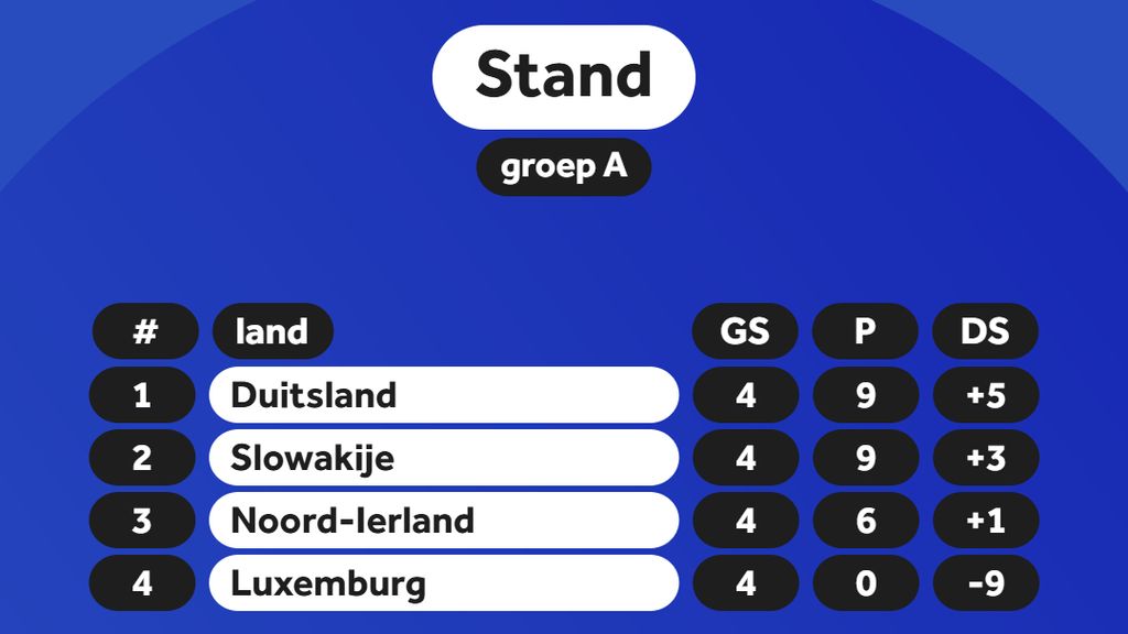 Met nog twee wedstrijden voor de boeg staat Duitsland met negen punten aan de leiding. Het doelsaldo van de Duitsers is beter dan dat van Slowakije, dat met 2-0 won van Luxemburg en evenveel punten heeft.
